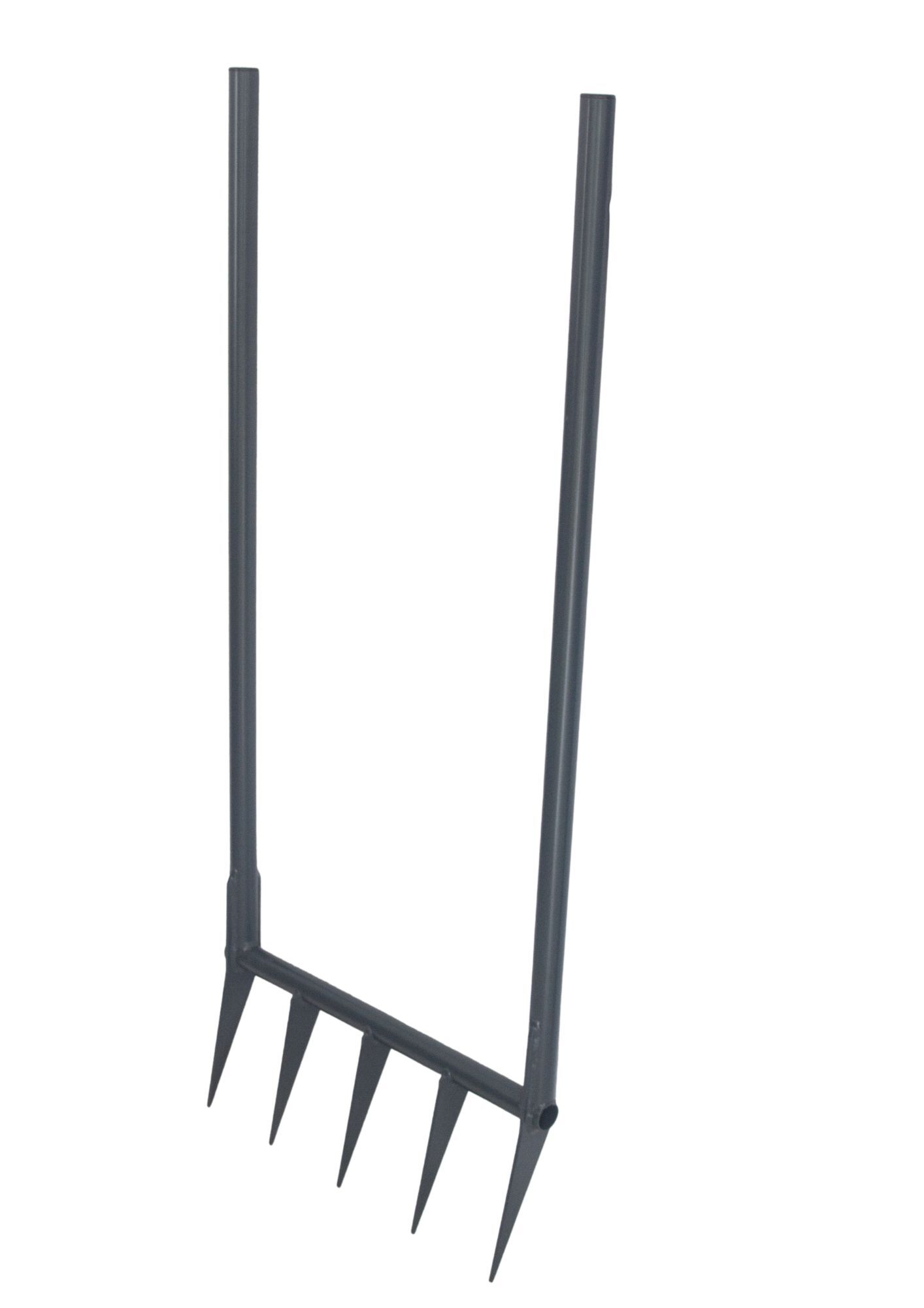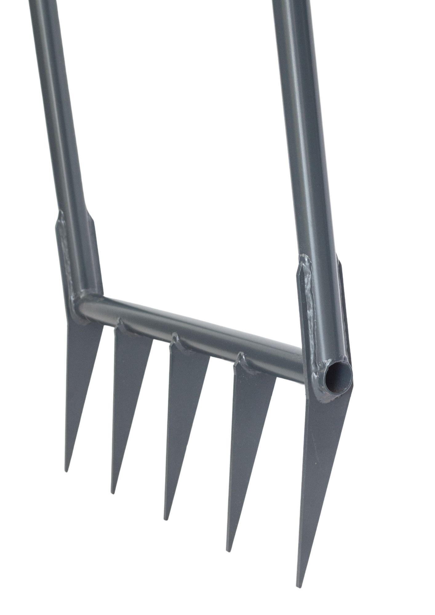 The business end of the Aardfork is made of a 60cm long thick-walled cross bar 38mm in diameter onto which are welded 5 profile cut 23cm tines, angled for easy penetration into the soil. We find that the round foot-bar provides a more comfortable surface for your feet than a square bar. Welded to the foot-bar are two upright handles 120cm long, finished with plastic caps. The entire unit is double-powder coated, first with an anti-corrosion e-coat, and then with a durable outer finish.