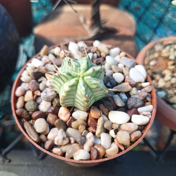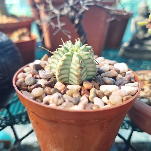 Gymnocalycium mihanovichii variegata, commonly known as the Variegated Moon Cactus, is a striking and unique cactus characterized by its vibrant, multicolored tops, which are often bright yellow, pink, or red. The colorful crown is a result of a lack of chlorophyll, making it an interesting addition to any succulent collection. The base of the cactus is typically a green Gymnocalycium, which provides stability and nutrients to the colorful top. This plant is often grafted onto a more resilient cactus species to enhance its growth and longevity.