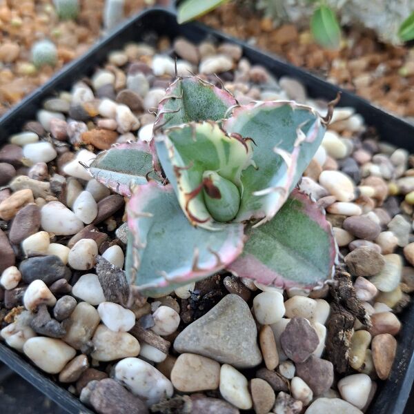 Agave titanota ‘Blue Diamond’ is a stunning, compact agave known for its bold blue-gray leaves with dramatic, contrasting white margins and sharp black spines. This slow-growing succulent forms a tight rosette and is perfect for containers or dry landscape gardens. It prefers full sun and minimal water.