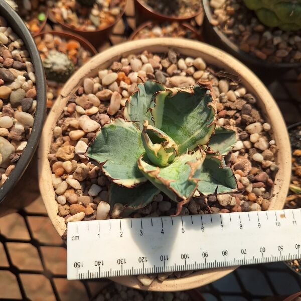 Agave titanota ‘Blue Diamond’ is ’n pragtige vetplant wat waardeer word vir sy kompakte vorm en dramatiese blare. Die dik, breë blare het ’n poeïerig blougrys kleur, met donker, kontrasterende tandjies langs die rande wat dit ’n opvallende, beeldhou-agtige voorkoms gee. Inheems aan die droë streke van Mexiko, floreer dit in vol son en goed dreinerende grond — ideaal vir rotstuine, droë landskappe of houertuine. Al lyk dit robuust, bring dit tog ’n elegante strukturele element na enige spasie. Dit’s droogtebestand en maklik om te versorg — ’n ware juweel vir versamelaars en liefhebbers van woestynplante.