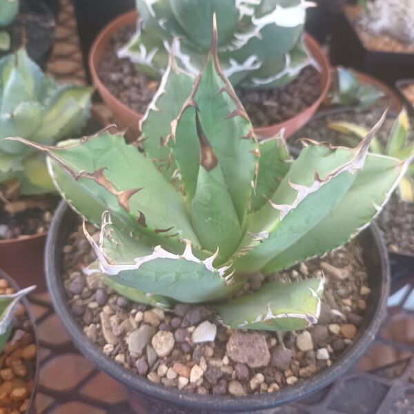 Agave titanota ‘Red Catweazle’ is ’n opvallende vetplant met ’n kompakte vorm, dik blougrys blare en dramatiese rooi dorings. Hierdie seldsame kultivar bring sterk tekstuur en kleur na enige tuin of houer en floreer in sonnige, droë toestande.