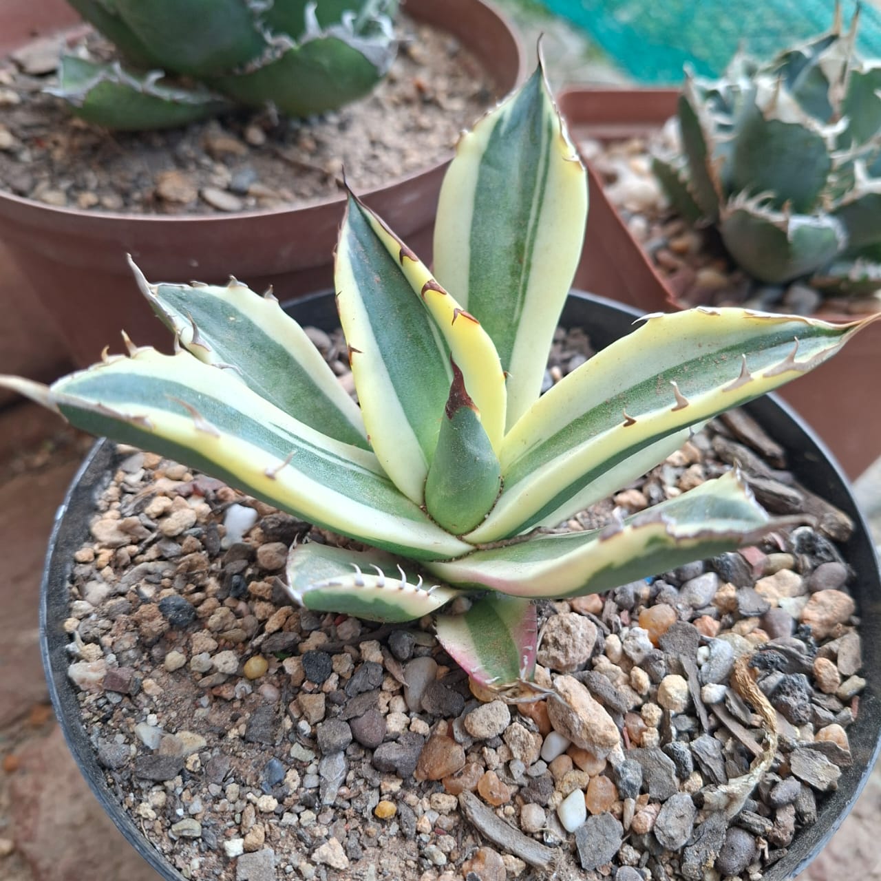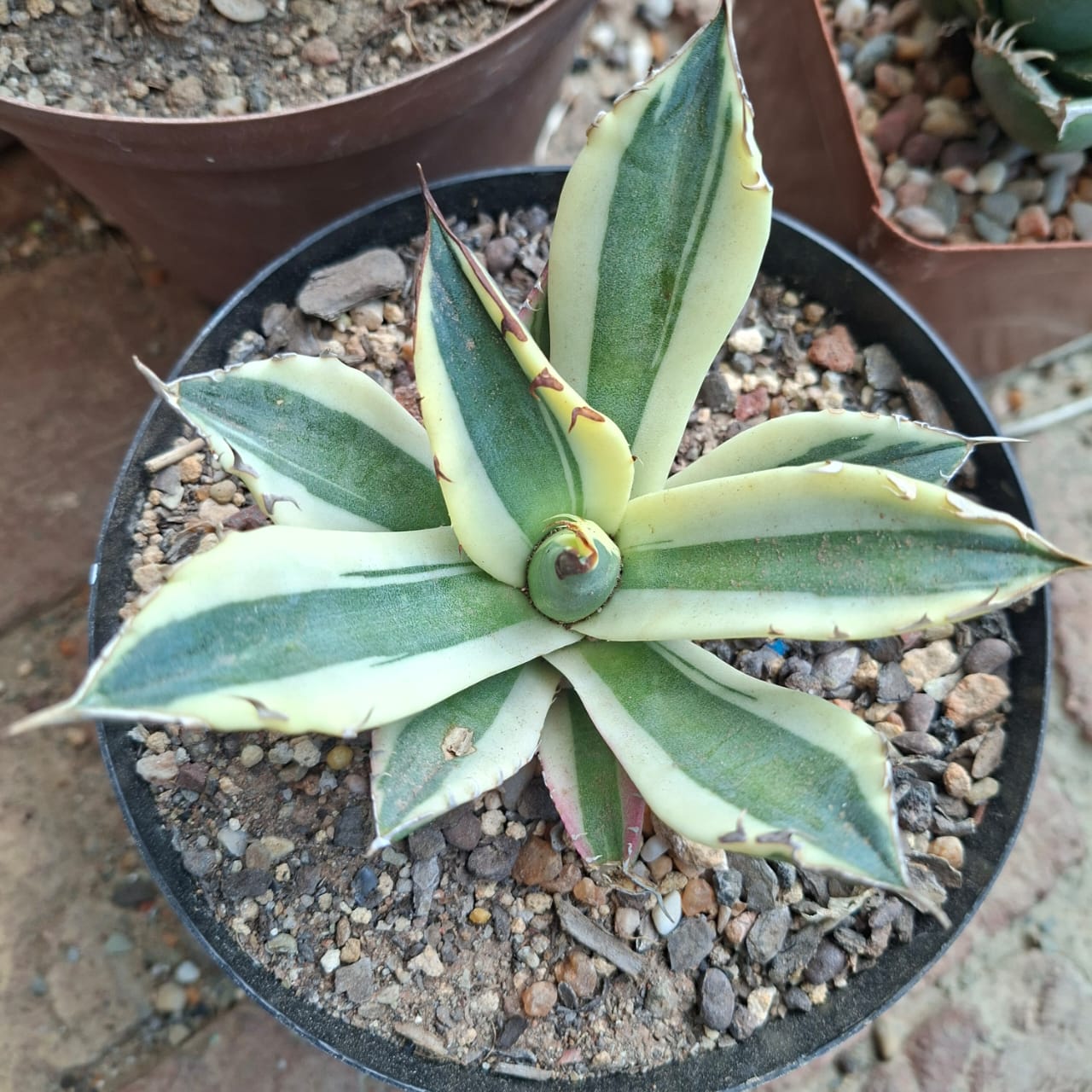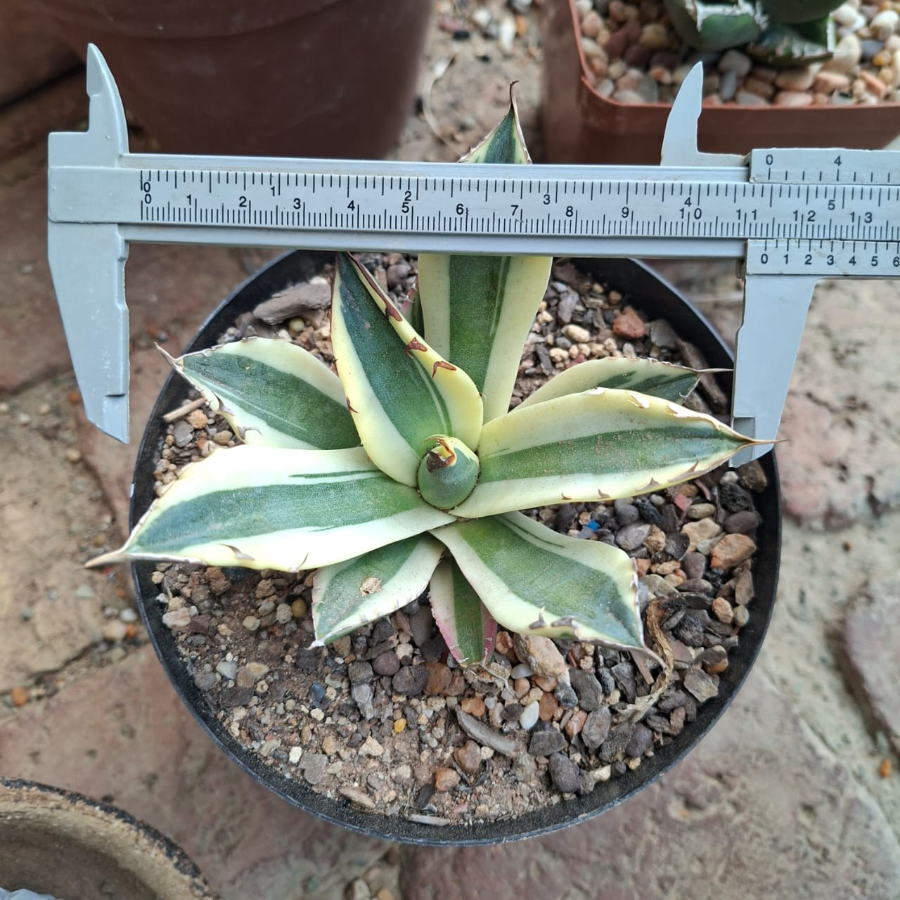 Die Agave titanota ‘Snuggle Tooth’ is ‘n baie gesogte, kompakte vetplant wat waardeer word vir sy strukturele vorm en unieke blare. Hierdie uitsonderlike kultivar het breë, blougrys blare met opvallende wit rande en dekoratiewe tandagtige stekels, wat dit ‘n elegante en beeldskone voorkoms gee.