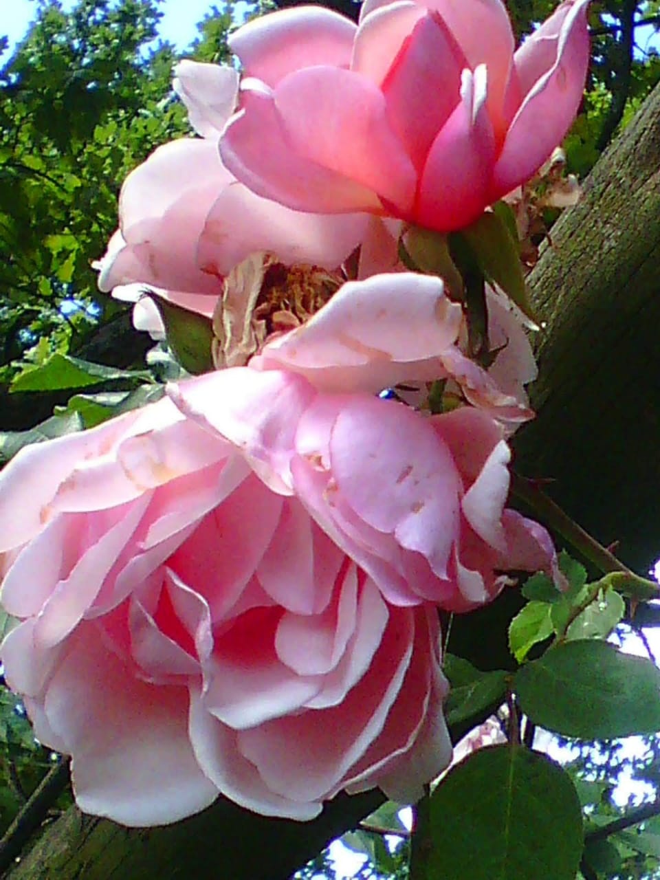 Reddish-salmon buds open to large, loosely double, light pink blooms with some of the character of a Hybrid Tea rose. They have a wonderfully strong, rich fruity fragrance. Its growth is branching and bushy, with small dark green leaves.