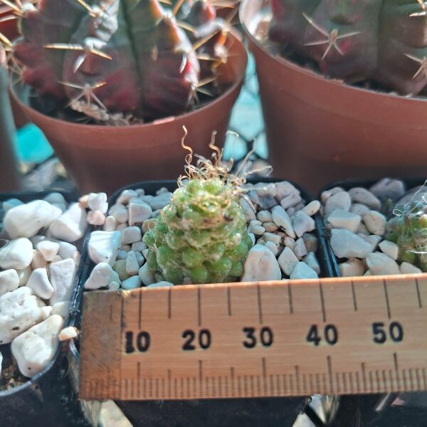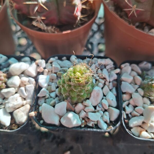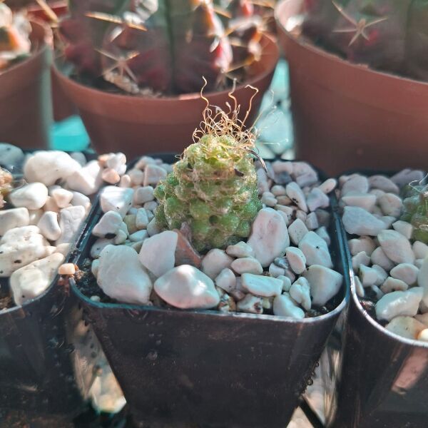 Anacampseros baeseckei is a small, slow-growing succulent native to South Africa and Namibia. It forms compact clusters of short, cylindrical stems covered in dense, fuzzy white hairs that give it a soft, woolly appearance. The leaves are green but often turn purplish-red under bright light. In summer, it produces vibrant magenta-pink flowers that open during the afternoon. It thrives in well-draining soil with minimal watering and bright, filtered light—perfect for collectors and small-space gardens.