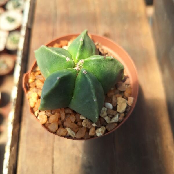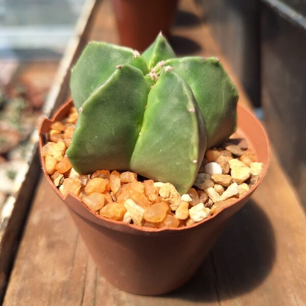 Astrophytum Myriostigma Fukuryu Nudum, commonly known as the “Bishop’s Cap Cactus,” is a rare and unique cactus variety characterized by its smooth, spineless, and glossy green skin. The “Fukuryu” variant features fascinating ridges and patterns that add to its visual appeal. It typically grows in a star-shaped form with multiple ribs, making it a favorite among cactus collectors.