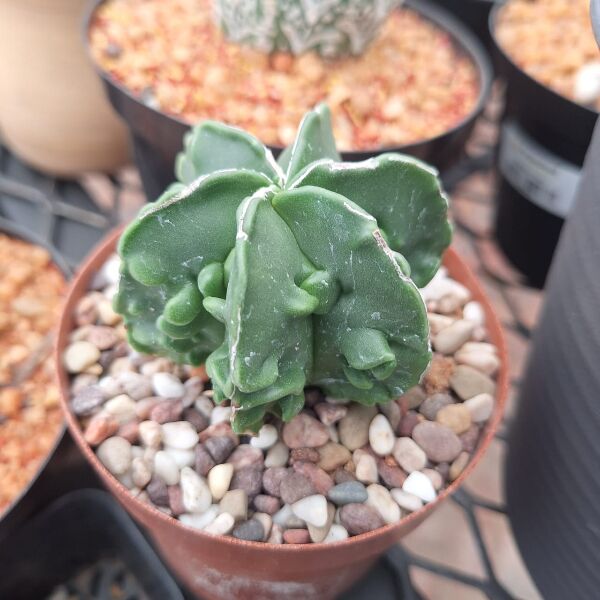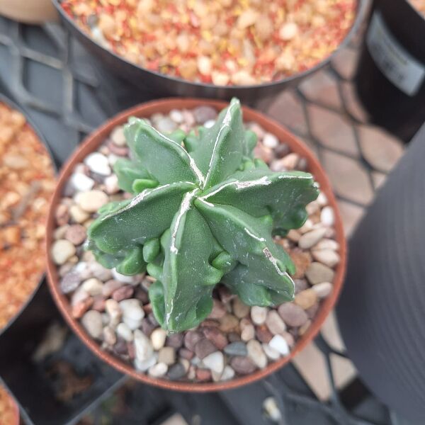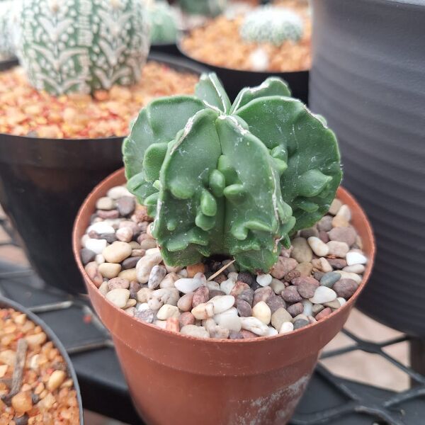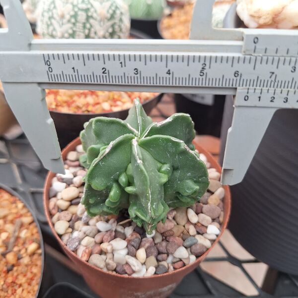 Astrophytum Myriostigma Fukuryu Nudum, commonly known as the “Bishop’s Cap Cactus,” is a rare and unique cactus variety characterized by its smooth, spineless, and glossy green skin. The “Fukuryu” variant features fascinating ridges and patterns that add to its visual appeal. It typically grows in a star-shaped form with multiple ribs, making it a favorite among cactus collectors.