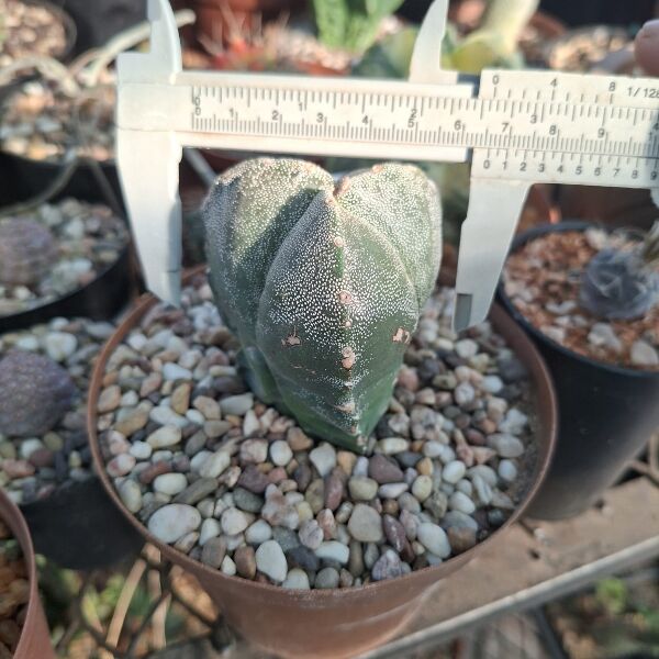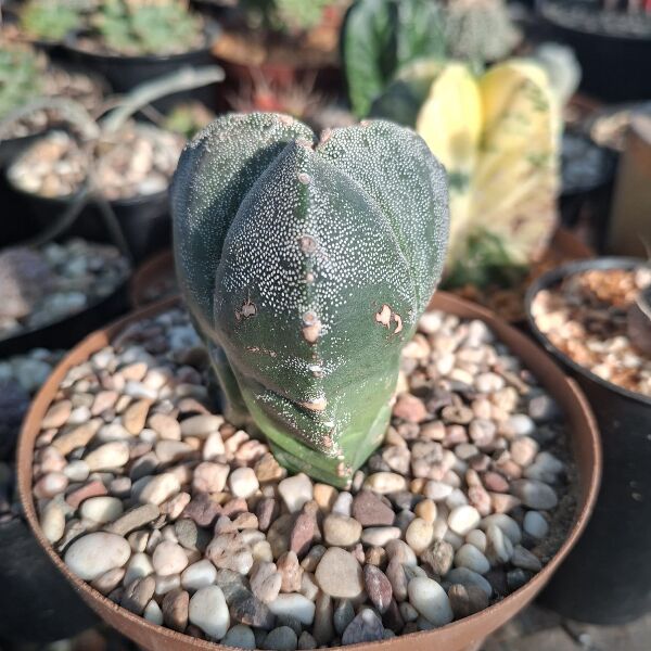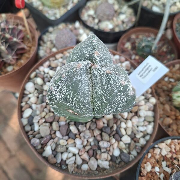 Astrophytum myriostigma var. tricostatum is ‘n seldsame en opvallende variëteit van die Biskopsmuts-kaktus, wat afkomstig is van Mexiko. Anders as die gewone vyf-rib vorm, het hierdie variëteit gewoonlik net drie duidelike ribbes (vandaar “tricostatum”). Dit het ‘n gladde, doringlose oppervlak met fyn wit kolletjies wat dit ‘n steragtige voorkoms gee. Die kaktus produseer geel, madeliefie-agtige blommetjies aan die bokant in die lente of somer. Vanweë sy unieke vorm en maklike versorging, is dit baie gewild onder kaktusversamelaars en vetplantliefhebbers.