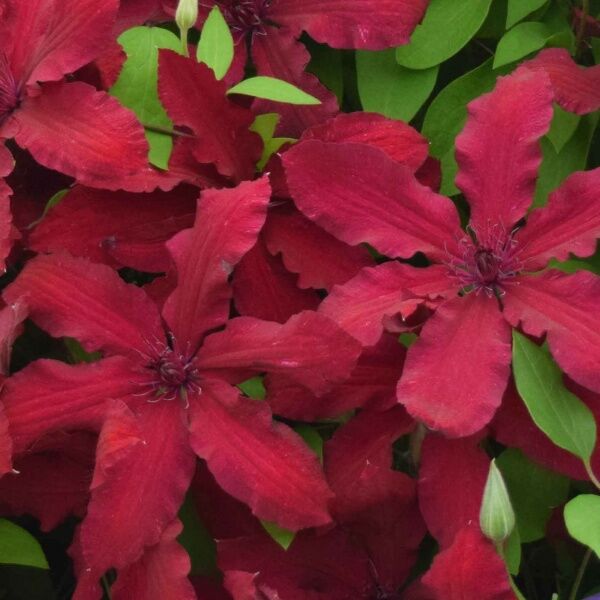 The Clematis Ruutle, dark red star shaped flowers. Ruutle brings a delightful splash of colour and character to your garden. Flowering generously from spring to early autumn, this charming clematis adds a whimsical, romantic touch to any sunny or semi-shaded space.