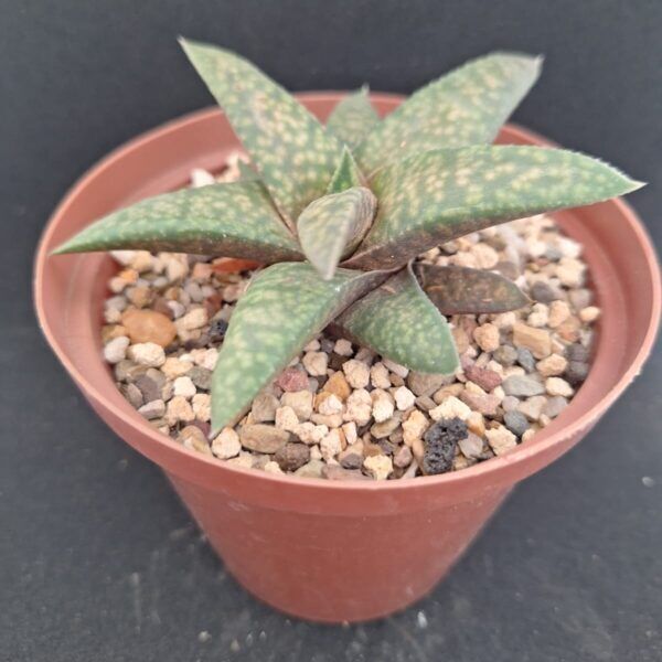 Haworthia tessellata is a small, slow-growing succulent native to southern Africa. It is known for its distinctive, thick, triangular leaves that form a rosette. The leaves are dark green to brownish and feature a unique, tessellated (checkerboard-like) pattern on their surface, which gives the plant its name. This pattern helps it blend into its natural rocky surroundings. Haworthia tessellata prefers indirect light and well-draining soil, making it an excellent and easy-to-care-for houseplant.
