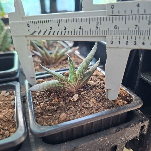 Gasteria lilliputana is a tiny, yet striking succulent native to South Africa. This miniature plant features thick, fleshy leaves that form a dense rosette, with dark green to greyish-green coloring and distinctive white markings or spots. The leaves are rough to the touch, giving it a unique texture that stands out in succulent collections. In late winter or early spring, it produces small, tubular flowers in shades of pink or red, adding a pop of color to its compact form. Interesting fact: Despite its small size, Gasteria lilliputana is extremely hardy and can tolerate drought and neglect, making it an ideal choice for beginner succulent growers. Its slow-growing nature also means it requires minimal maintenance and thrives in bright, indirect light.