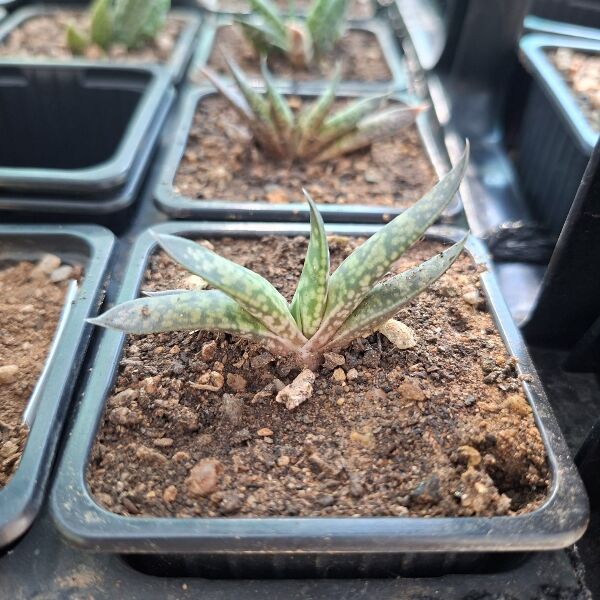 Gasteria lilliputana is ‘n klein, maar indrukwekkende vetplant wat oorspronklik uit Suid-Afrika kom. Hierdie miniatuurplant het dik, vlesige blare wat ‘n digte roset vorm, met donker groen tot grys-groen kleur en kenmerkende wit kolle of merke. Die blare is growwe om aan te raak, wat dit ‘n unieke tekstuur gee wat uitstaan in vetplantversamelings. In die laat winter of vroeë lente, produseer dit klein, buisvormige blomme in skakerings van pienk of rooi, wat ‘n kleurvolle aksent by sy kompakte vorm voeg. Interessante feit: Ten spyte van sy klein grootte, is Gasteria lilliputana uiters taai en kan dit droogte en verwaarlozing verdra, wat dit ‘n ideale keuse maak vir beginners wat vetplante kweek. Sy stadig-groeiende aard beteken ook dat dit min onderhoud benodig en floreer in helder, indirekte lig.