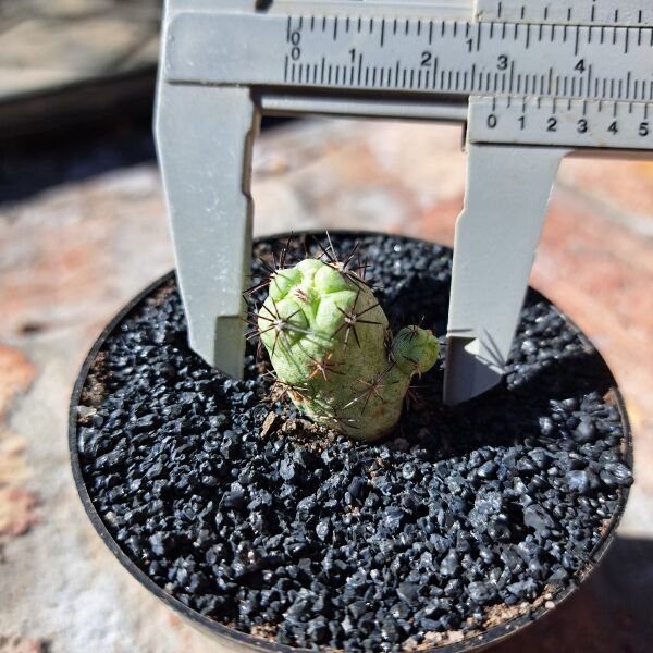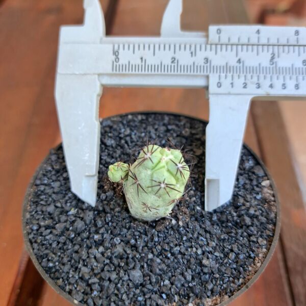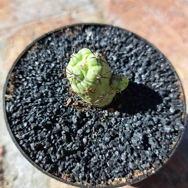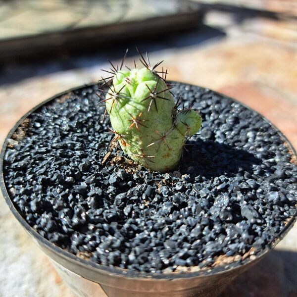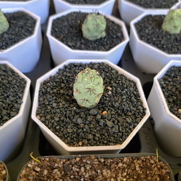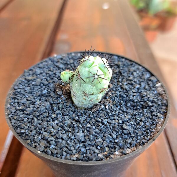 Ortegocactus macdougallii is a rare and unique species of cactus native to a small region in Oaxaca, Mexico. It is a small, globular cactus that usually grows as a solitary plant but can form small clusters over time. The body is dark green to gray-green with distinctive black spines and a slightly woolly crown. One of its most striking features is the chalky, bluish-grey coating on the skin, which helps protect it from intense sunlight. It produces bright yellow flowers in spring or early summer. Due to its limited natural habitat, it is considered a vulnerable species and is prized by cactus collectors.