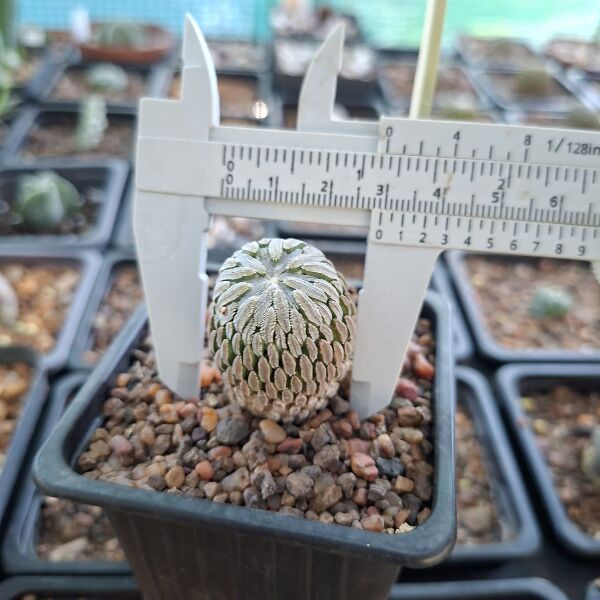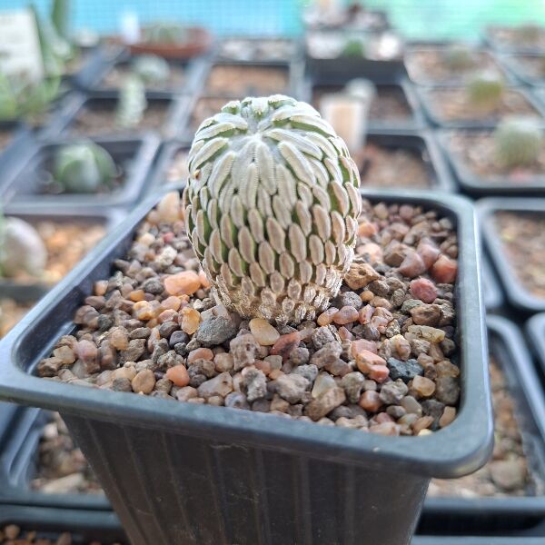Pelecyphora aselliformis is a small, globular cactus prized for its dense, bristly spines that resemble tiny worms, giving it a highly textured, almost sculptural appearance. It produces small, magenta to purple flowers at the crown, adding a vibrant contrast to its grey-green body. This slow-growing cactus thrives in bright light and well-drained soil, making it a fascinating specimen for succulent and cactus collections.