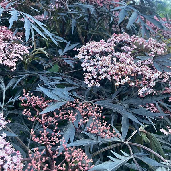 This ornamental perennial has deeply cut, beautiful, dark purple black foliage that resembles finely cut lace, giving it an effect similar to that of Japanese maple. It has lemon-scented, pink flowers and dark blackish-red fruits. It likes full sun to partial shade.