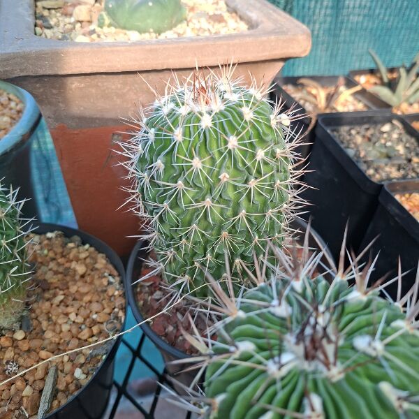 Stenocactus multicostatus is a distinctive cactus known for its many thin, wavy ribs that create a beautifully textured, spherical form. Its intricate structure gives it a sculptural appearance, while delicate flowers in shades of white to pale pink often bloom from the crown. This compact cactus thrives in bright light and well-drained soil, making it an excellent choice for containers and specialist cactus collections.